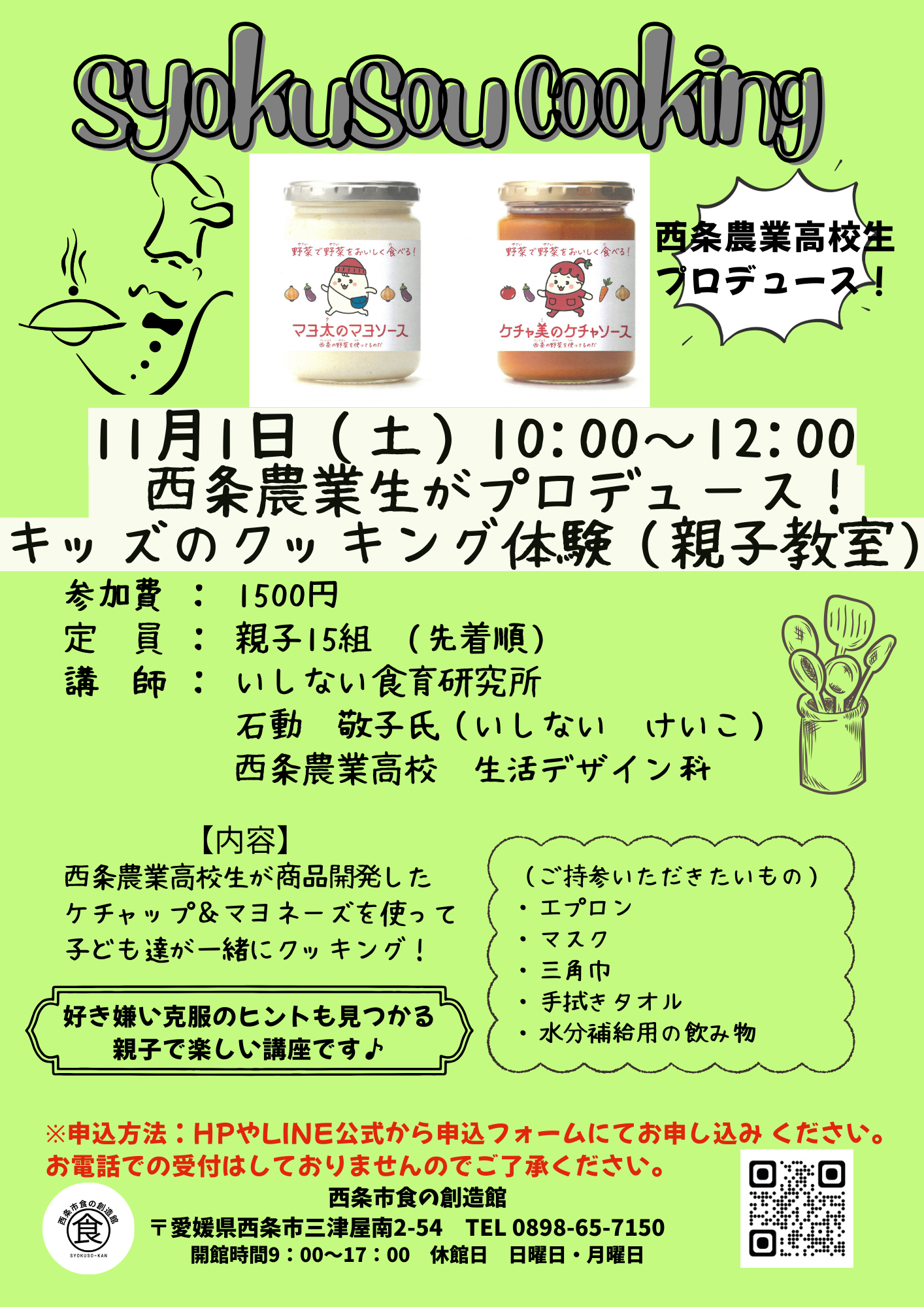 | 内 容 | 西条農業高校生が商品開発したケチャップ&マヨネーズを使って子ども達が一緒にクッキング! 好き嫌い克服のヒントも見つかる、親子で楽しい講座です! |