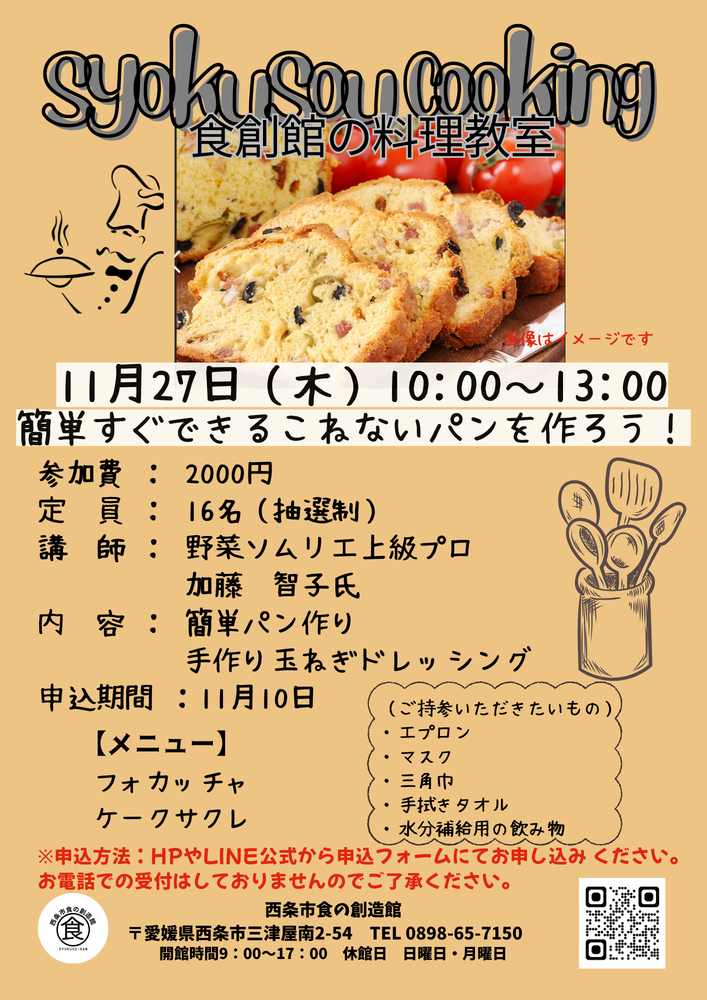 食創館の料理教室 , 食創館からのお知らせ 11/27(木)開催★簡単すぐできる こねないパンを作ろう!【食創館の料理教室】 2025.10.18 食創館の料理教室 , 食創館からのお知らせ お申込フォーム 11/1(土)開催★西条農業生がプロデュース!キッズのクッキング体験【食創館の料理教室】前の記事 11/15(土)開催★あんこでお花のクッキーを創ろう!【食創館の料理教室】次の記事 新着のお知らせ 11/15(土)開催★あんこでお花のクッキーを創ろう!【食創館の料理教室】 2025.10.18 11/1(土)開催★西条農業生がプロデュース!キッズのクッキング体験【食創館の料理教室】 2025.10.09 10/29(水)おいしいを届ける SNS活用術【食創館のイベント】 2025.09.19 10/22(水)スマホで撮る!おいしそうな料理写真のコツ【食創館のイベント】 2025.09.19 9/26(金)開催★災害から身を守るための勉強会&ポリ袋で料理を作ろう【食創館の料理教室】 2025.08.23