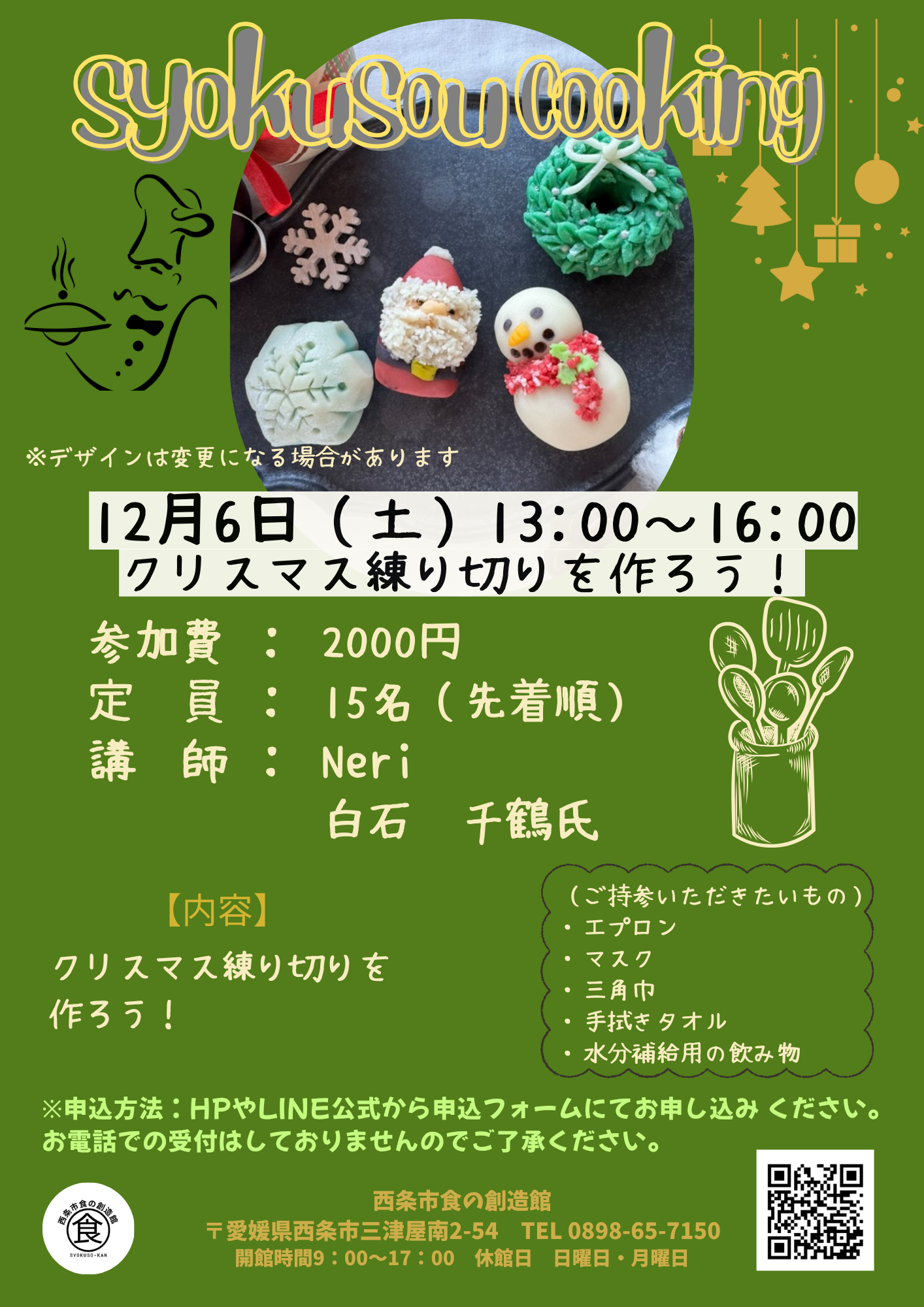 食創館の料理教室 , 食創館からのお知らせ , 募集中 12/6(土)開催★季節の彩り和菓子を作って撮りましょう!【食創館の料理教室】 2025.11.12 食創館の料理教室 , 食創館からのお知らせ , 募集中 お申込フォーム 12/20(土)開催★親子でクリスマスケーキを作ろう!【食創館の料理教室】前の記事 新着のお知らせ 12/20(土)開催★親子でクリスマスケーキを作ろう!【食創館の料理教室】 2025.11.12 12/3(水)開催★家でもできるクリスマス料理を作ろう!【食創館の料理教室】 2025.11.12 11/15(土)開催★あんこでお花のクッキーを創ろう!【食創館の料理教室】 2025.10.18 11/27(木)開催★簡単すぐできる こねないパンを作ろう!【食創館の料理教室】 2025.10.18 11/1(土)開催★西条農業生がプロデュース!キッズのクッキング体験【食創館の料理教室】 2025.10.09