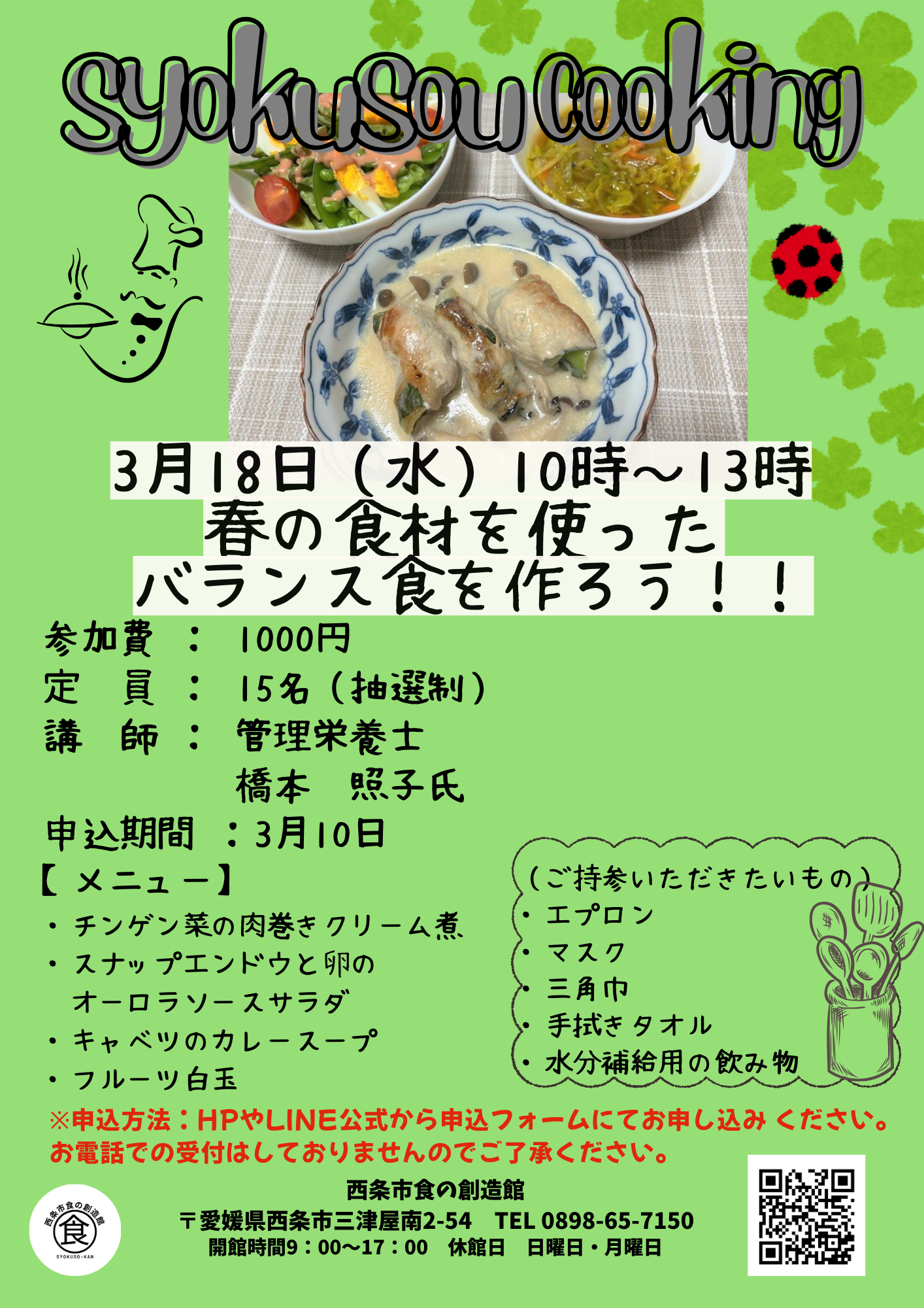 食創館の料理教室 , 食創館からのお知らせ , 募集中 3/18(水)開催★春の食材を使ったバランス食【食創館の料理教室】 2026.02.18 食創館の料理教室 , 食創館からのお知らせ , 募集中 2026.02.18 3/18(水)開催★春の食材を使ったバランス食【食創館の料理教室】 創館の料理教室 春の食材を使ったバランス食 開催日 2026年3月18日(水)10:00~13:00 開催場所 西条市 食の創造館 参加費 1,000円 定 員 15名(抽選制) 講 師 管理栄養士 橋本 照子 氏 ... 創館の料理教室 春の食材を使ったバランス食 開催日 2026年3月18日(水)10:00~13:00 開催場所 西条市 食の創造館 参加費 1,000円 定 員 15名(抽選制) 講 師 管理栄養士 橋本 照子 氏 ...お申込フォーム 2/25(水)開催★腸を元気にする麹料理を作ろう!【食創館の料理教室】前の記事 3/25(水)開催★食卓が華やぐ鶏肉料理を作ろう!【食創館の料理教室】次の記事 新着のお知らせ 3/28(土)開催★食創館【春マルシェ】 2026.02.18 3/25(水)開催★食卓が華やぐ鶏肉料理を作ろう!【食創館の料理教室】 2026.02.18 2/25(水)開催★腸を元気にする麹料理を作ろう!【食創館の料理教室】 2026.01.20 2/21(水)開催★食品サンプルで春を感じるあんみつを作ろう!【食創館の料理教室】 2026.01.20 1/28(水)開催★おいしいコーヒーの淹れ方講座!【食創館の料理教室】 2025.12.12